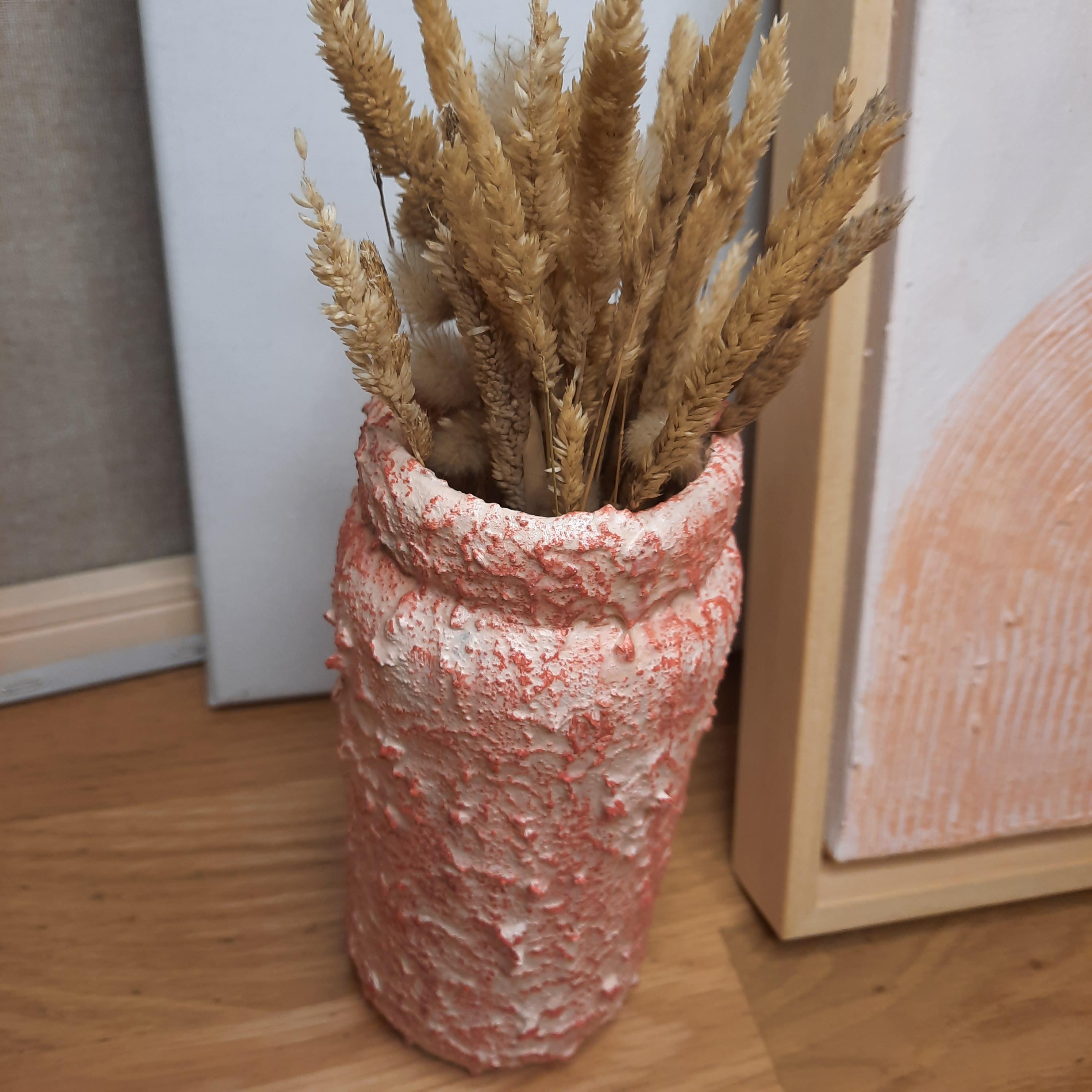 Técnica mista sobre frasco de vidro. Tinta acrílica, areia, gesso, casca de ovo e verniz protetor.